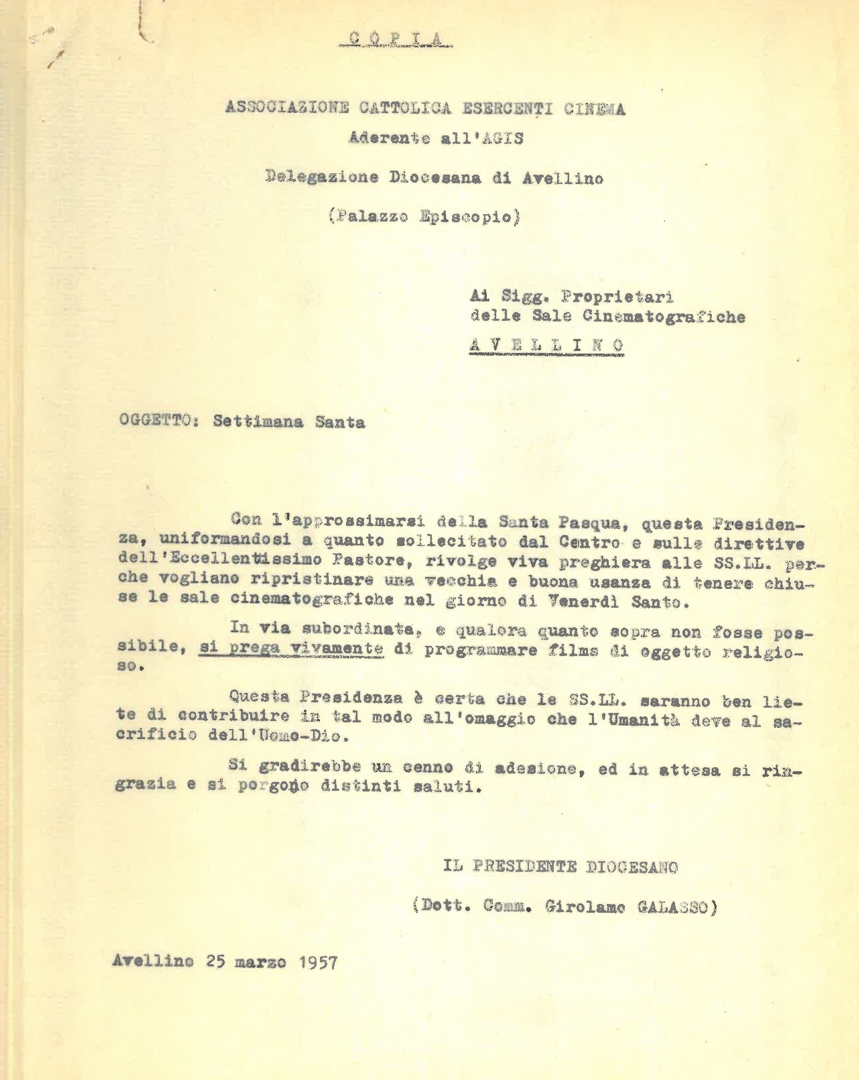 Lettera di Girolamo Galasso, presidente della delegazione diocesana di Avellino, ai proprietari delle sale cinematografiche della diocesi