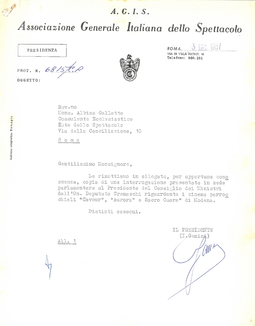 Lettera di Italo Gemini, presidente dell'Associazione Generale Italiana dello Spettacolo - AGIS, a mons. Albino Galletto, consulente ecclesiastico dell'Ente dello spettacolo