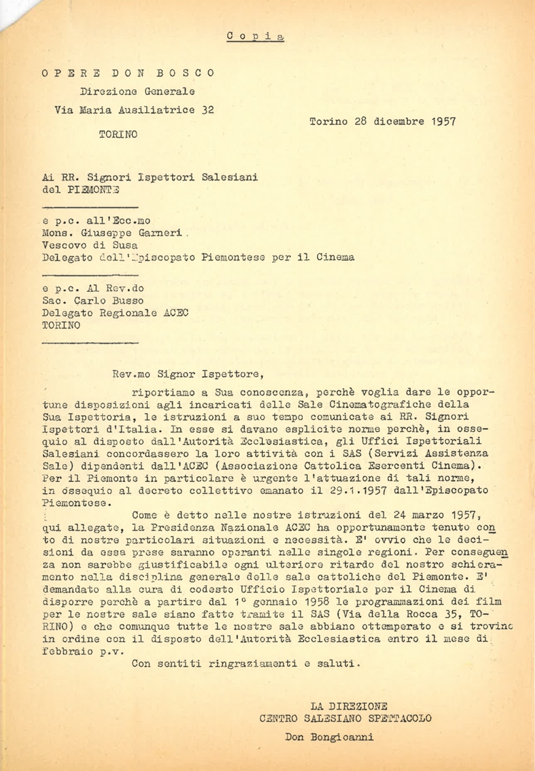 Don Marco Bongioanni scrive agli ispettori salesiani del Piemonte in merito alla necessità dell'osservanza delle norme e delle disposizioni dell'autorità ecclesiastica che regolano le attività dei cinema parrocchiali della regione. Dattiloscritto