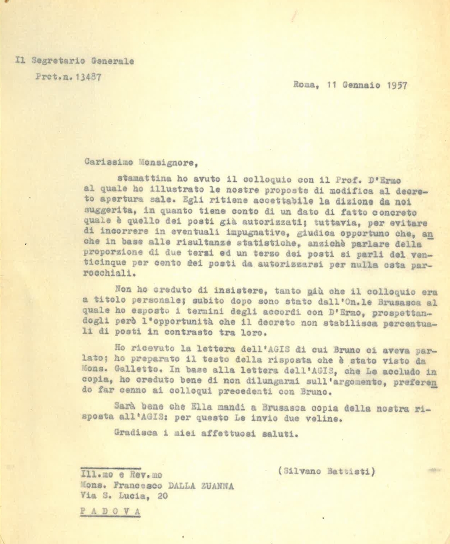 Silvano Battisti scrive a mons. Francesco Dalla Zuanna in merito alla proposta di modifica del decreto apertura sale riguardante la percentuale di posti da autorizzarsi per nulla osta parrocchiali. Datiloscritto