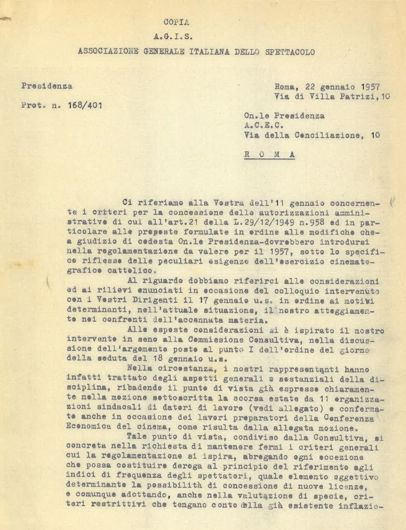Lettera di risposta di Italo Gemini, presidente dell'Associazione Generale Italiana dello Spettacolo - AGIS, a mons. Francesco Dalla Zuanna, presidente dell'ACEC