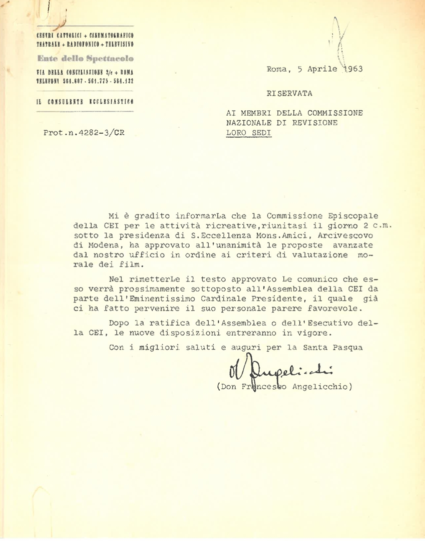 Con lettera di trasmissione di mons. Francesco Angelicchio, consulente ecclesiastico del Centro cattolico cinematografico, ai membri della Commissione nazionale di revisione. Dattiloscritto