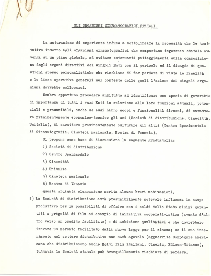 Nota sull'ingerenza statale nella composizione degli organi direttivi degli enti del settore dello spettacolo a carattere economico-tecnico e culturale. Dattiloscritto
