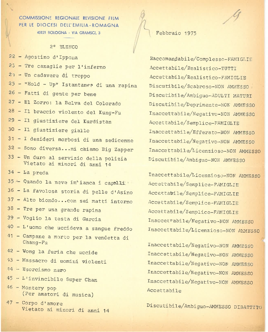 Classificazione di film, a cura della Commissione regionale di revisione film per le diocesi dell'Emilia-Romagna