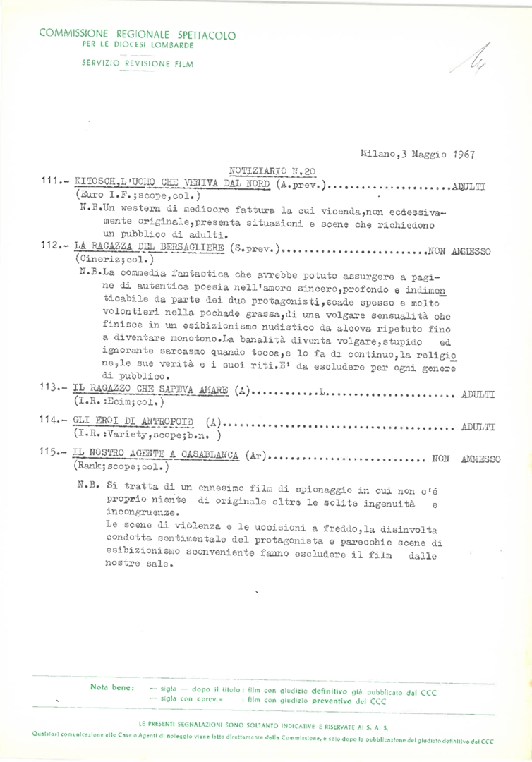 Elenco con i titoli dei film soggetti a revisione da parte della Commissione e relativo giudizio