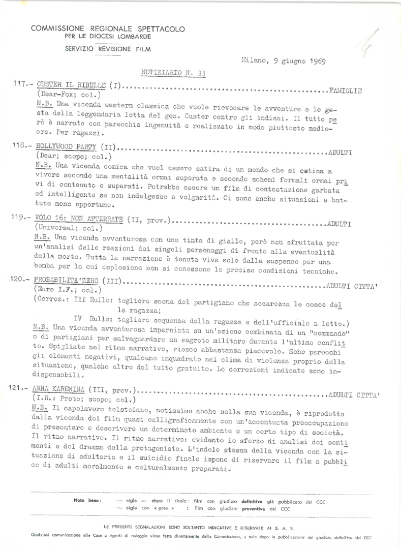 Commissione regionale spettacolo per le diocesi lombarde. Servizio revisione film. Notiziario, nn. 33-39