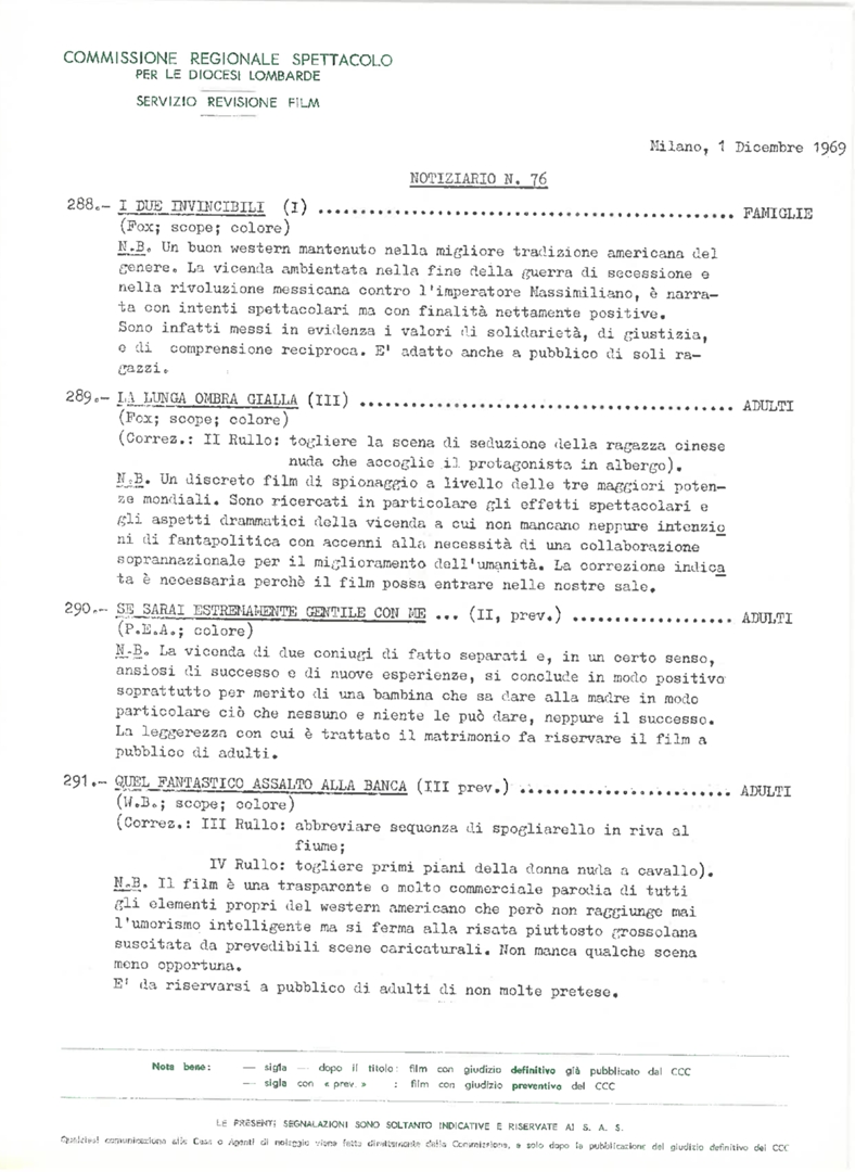 Commissione regionale spettacolo per le diocesi lombarde. Servizio revisione film. Notiziario, nn. 76-83