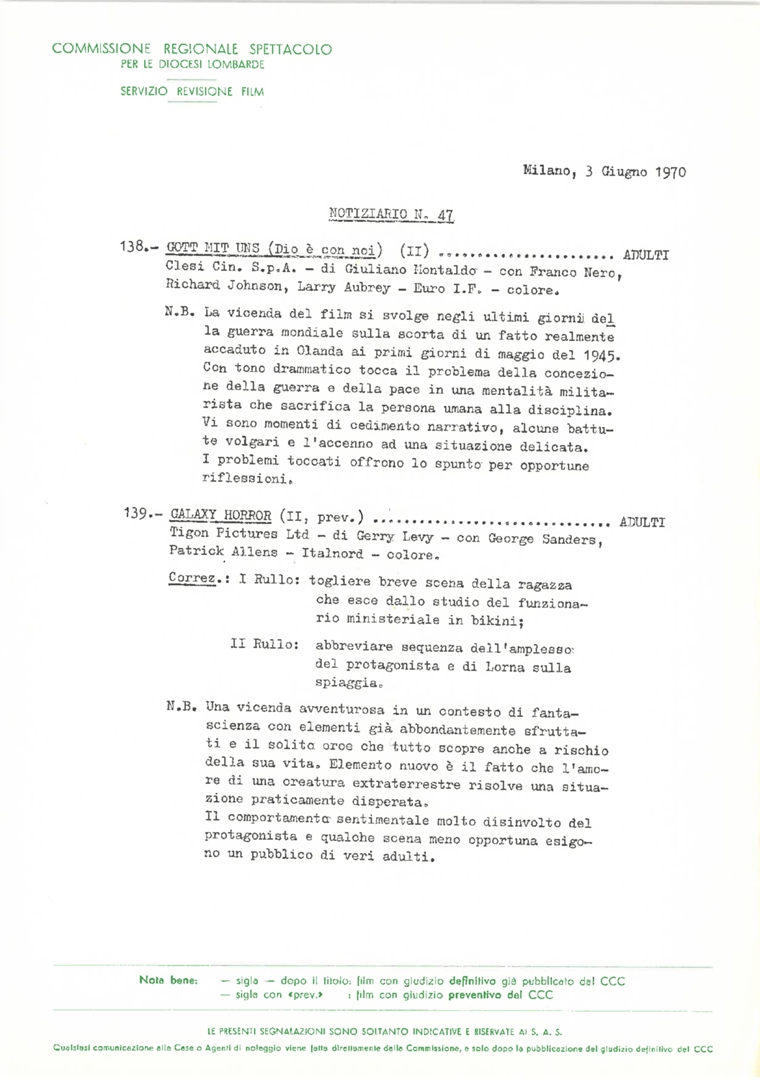 Commissione regionale spettacolo per le diocesi lombarde. Servizio revisione film. Notiziario, nn. 47-59