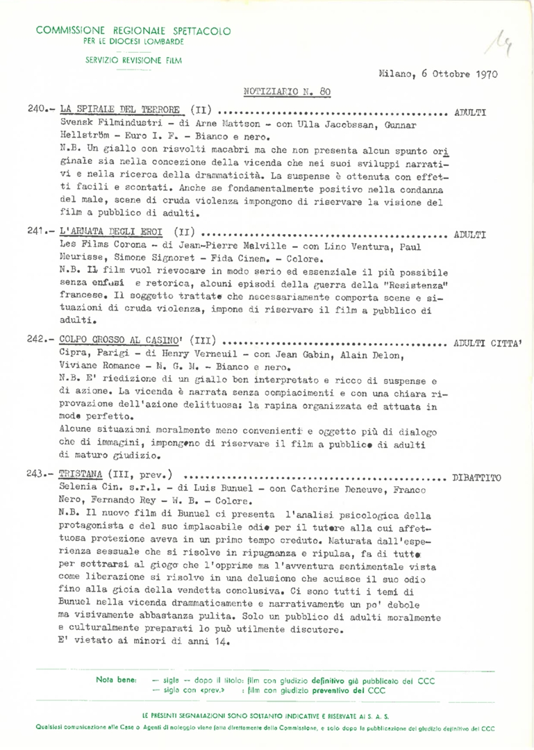 Commissione regionale spettacolo per le diocesi lombarde. Servizio revisione film. Notiziario, nn. 80-88