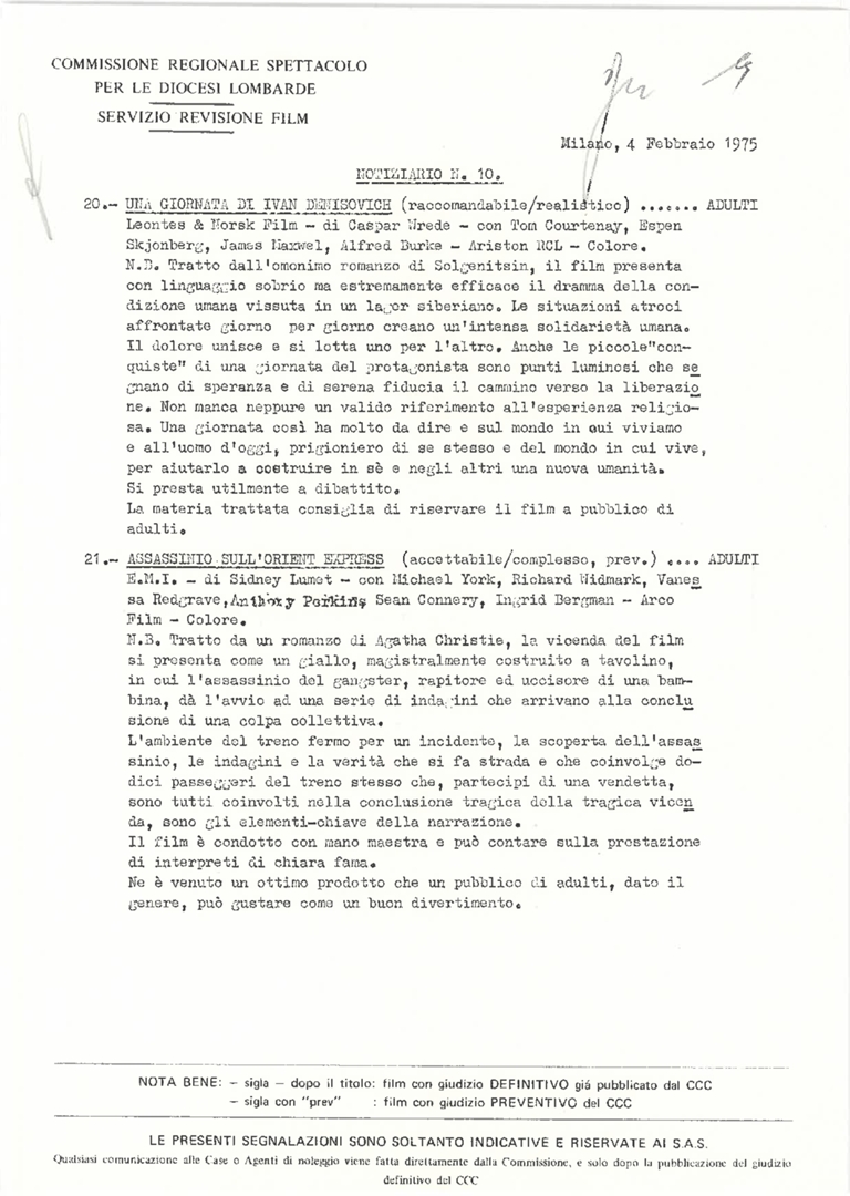 Commissione regionale spettacolo per le diocesi lombarde. Servizio revisione film. Notiziario, nn. 10-26