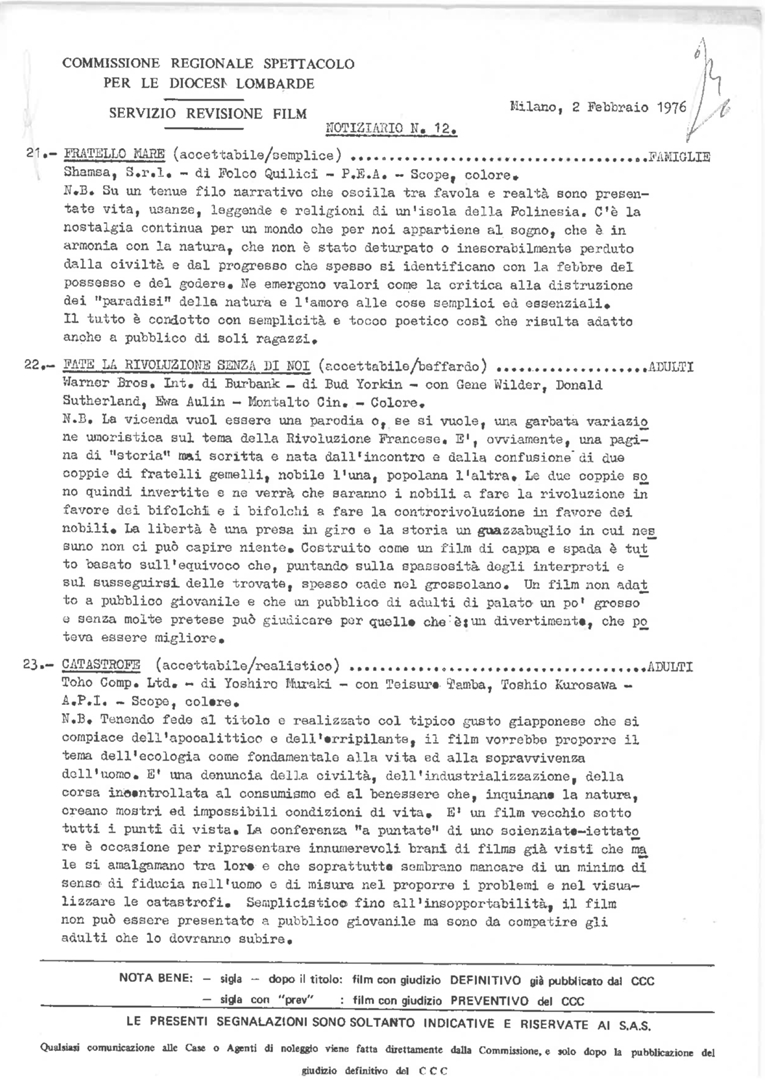 Commissione regionale spettacolo per le diocesi lombarde. Servizio revisione film. Notiziario, nn. 12-24