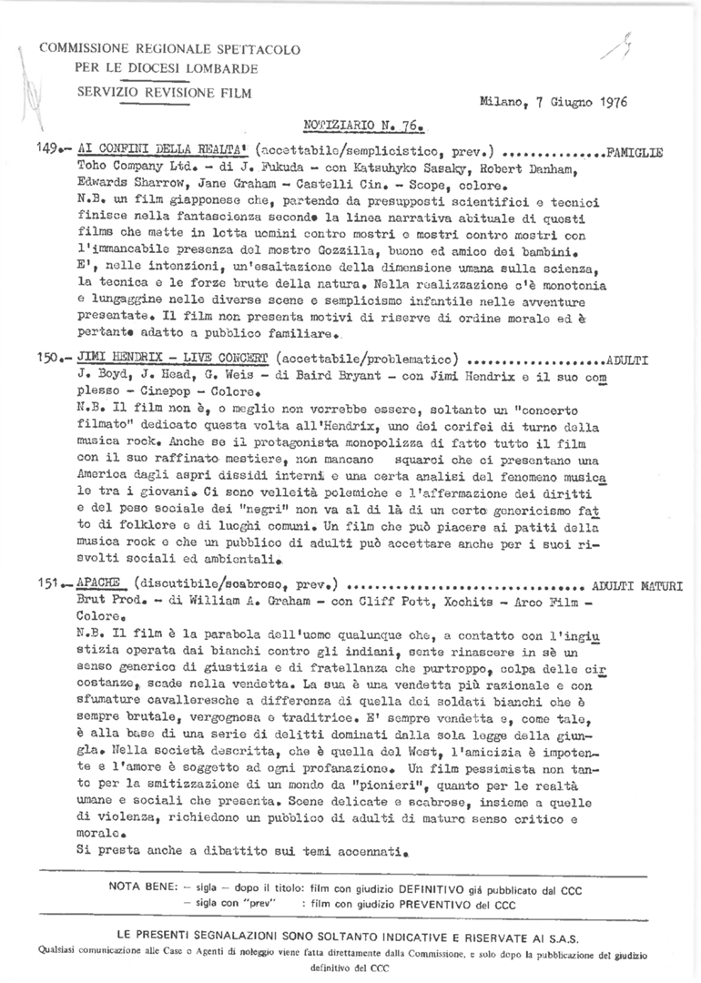 Commissione regionale spettacolo per le diocesi lombarde. Servizio revisione film. Notiziario, nn. 76-87 Elenco dei film soggetti a revisione da parte della Commissione e relativo giudizio