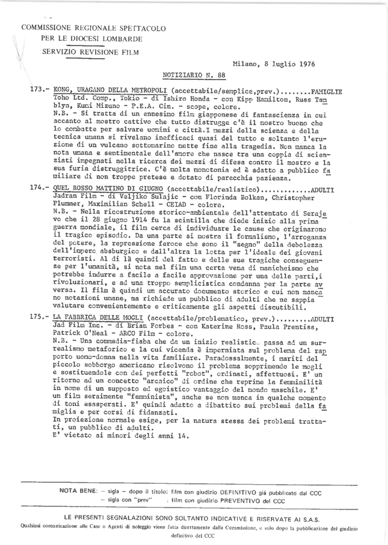 Commissione regionale spettacolo per le diocesi lombarde. Servizio revisione film. Notiziario, nn. 88-102