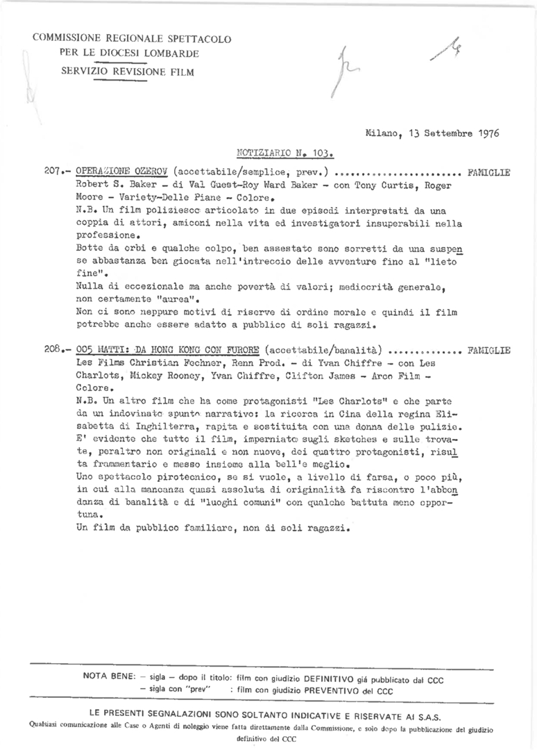 Commissione regionale spettacolo per le diocesi lombarde. Servizio revisione film. Notiziario, nn. 103-114 Elenco dei film soggetti a revisione da parte della Commissione e relativo giudizio