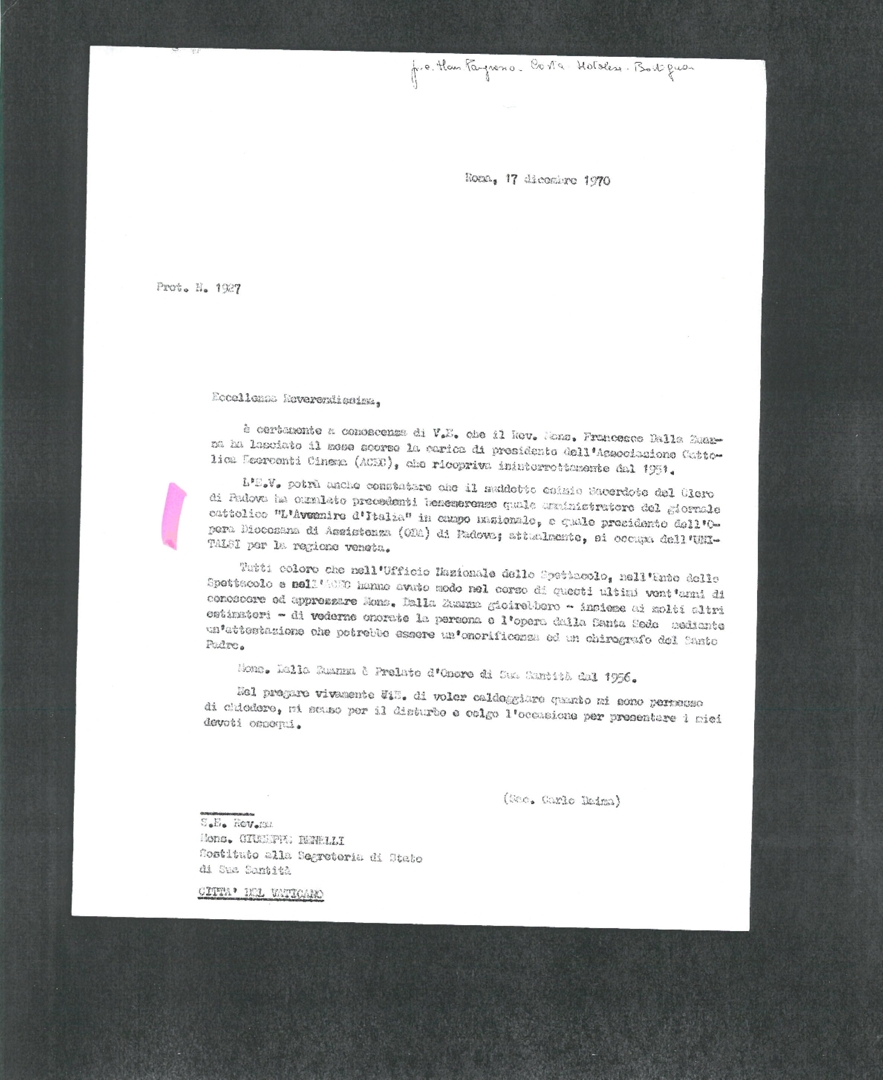 Carlo Baima scrive a Benelli per proporre che mons. Francesco Dalla Zuanna, già presidente dell'ACEC, venga insignito di un'onorificienza ed un chirografo papale