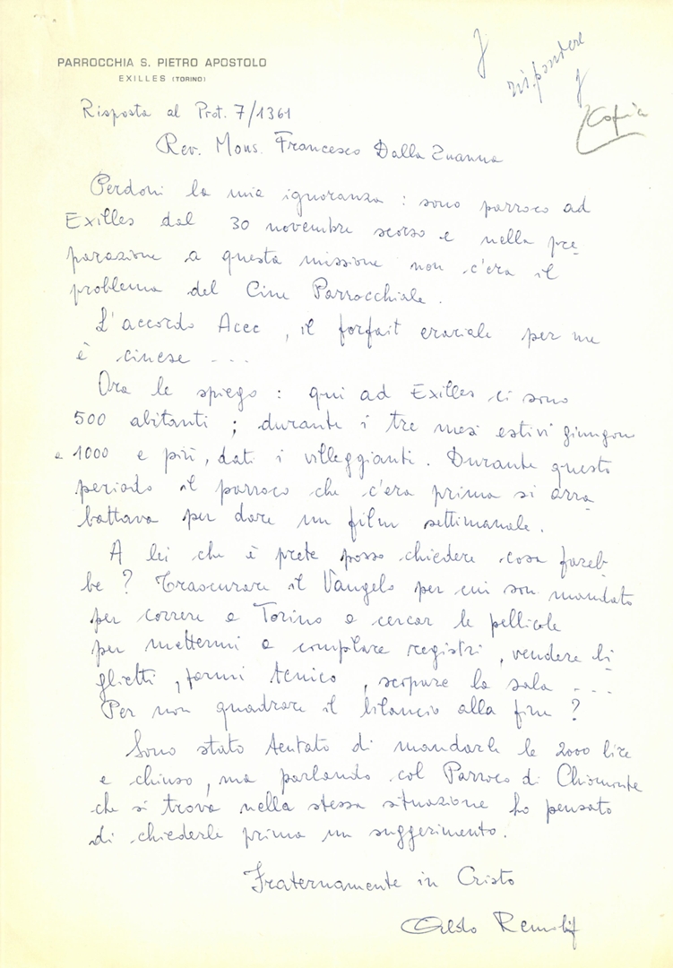 Copia della lettera con cui il parroco Remolif chiede a Dalla Zuanna indicazioni sull'organizzazione del cinema parrocchiale