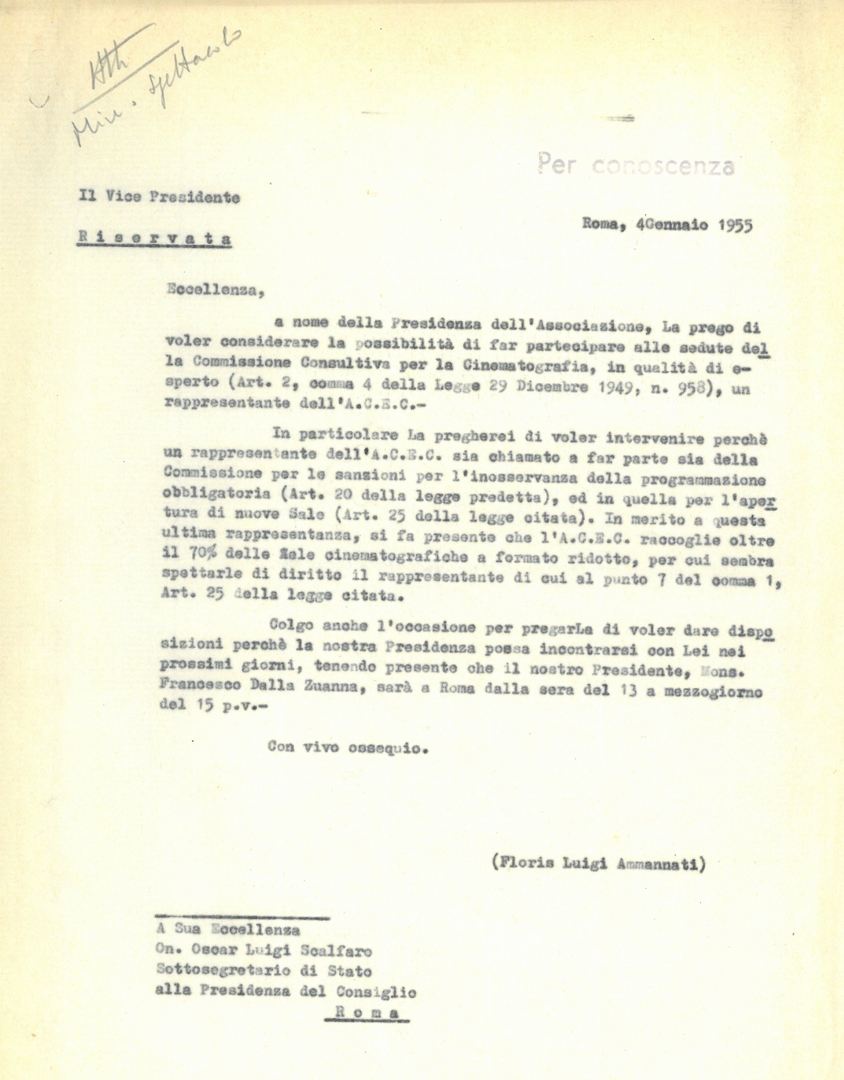 Lettera di Floris Luigi Ammannati, vice presidente dell'ACEC, a Oscar Luigi Scalfaro, sottosegreatrio di Stato alla presidenza del consiglio dei minsitri