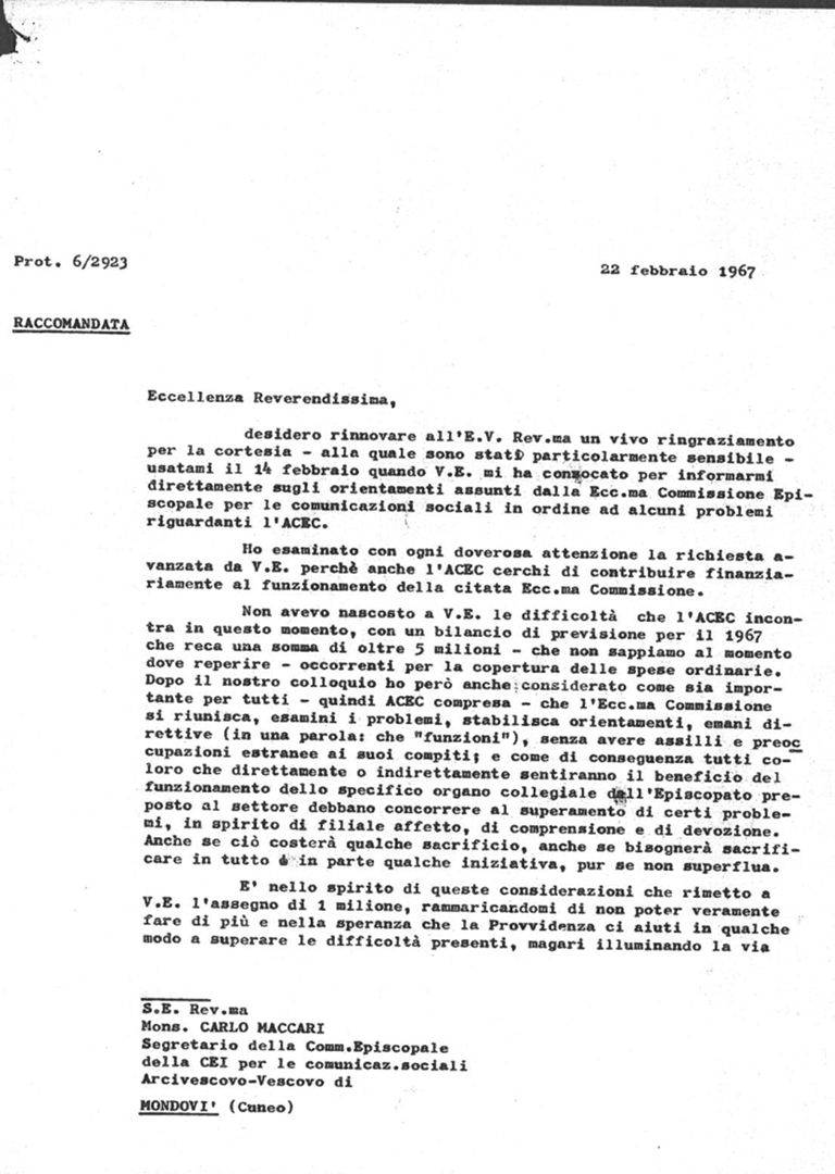 Dalla Zuanna scrive a Maccari in merito alle indicazioni della Commissione episcopale per le comunicazioni sociali relative ad alcuni aspetti economici riguardanti l'ACEC. Minuta