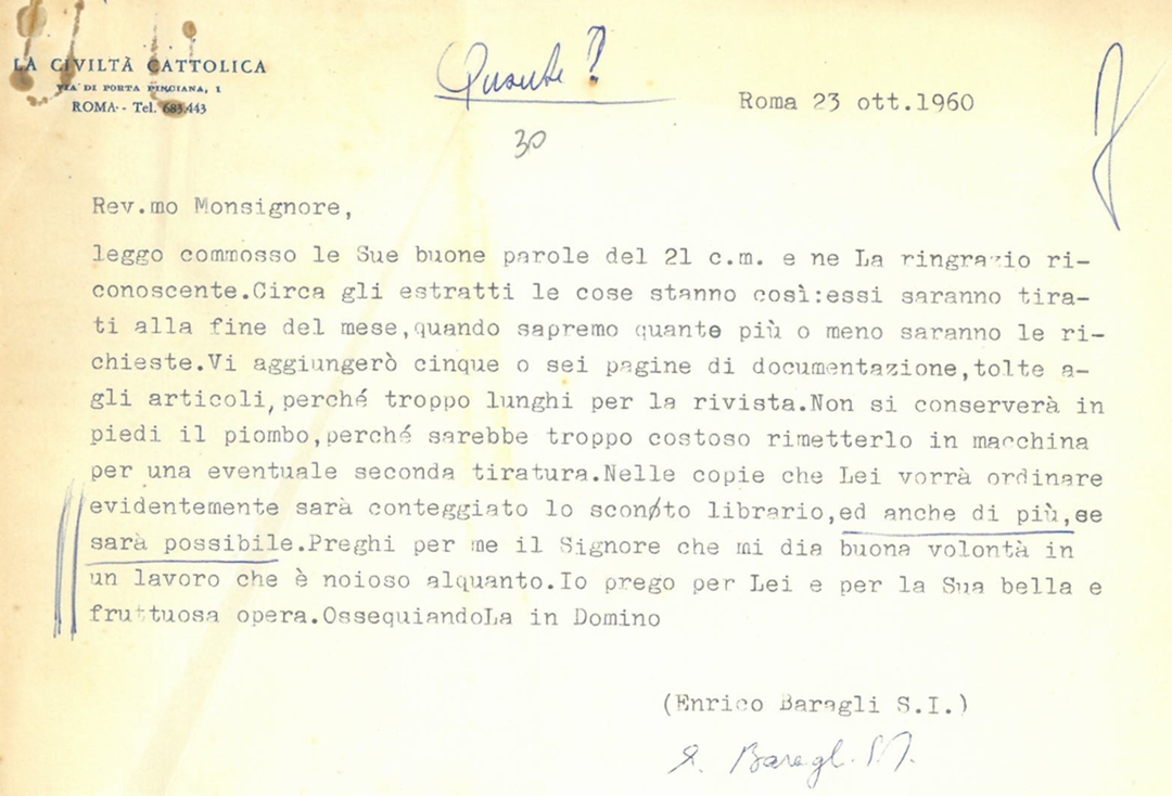 Nota di Enrico Baragli, gesuita e autore per la rivista Cività cattolica, per mons. Francesco Dalla Zuanna
