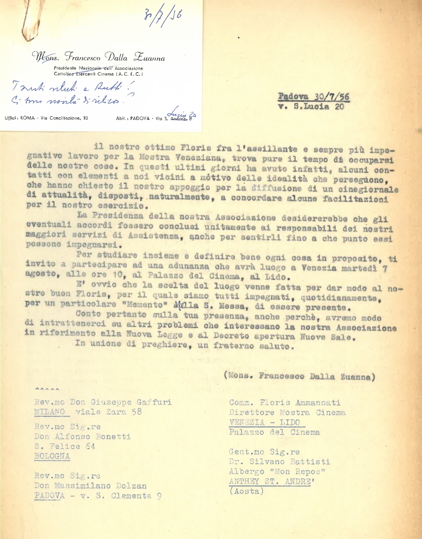 Dalla Zuanna propone a don Giuseppe Gafuri, don Alfonso Bonetti, don Massimo Dolzan, Luigi Floris Ammannati e Silvano Battisti, un incontro a Venezia in merito all'ipotesi di un appoggio dell'ACEC alla diffusione di un cinegiornale di attualità. Minuta