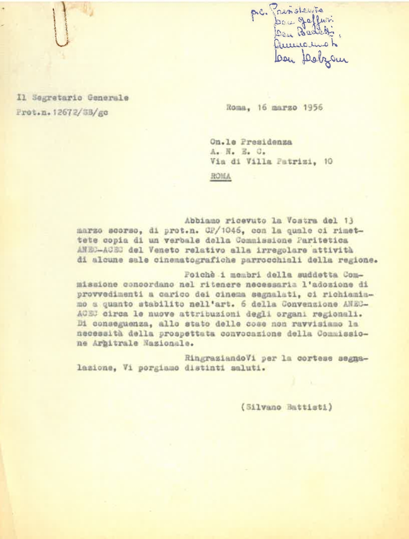 Battisti risponde in merito al verbale della Commissione paritetica ANEC-ACEC del Veneto. Per conoscenza invia anche ai responsabili SAS, don Giuseppe Gafuri, don Alfonso Bonetti, don Massimo Dolzan. Minuta
