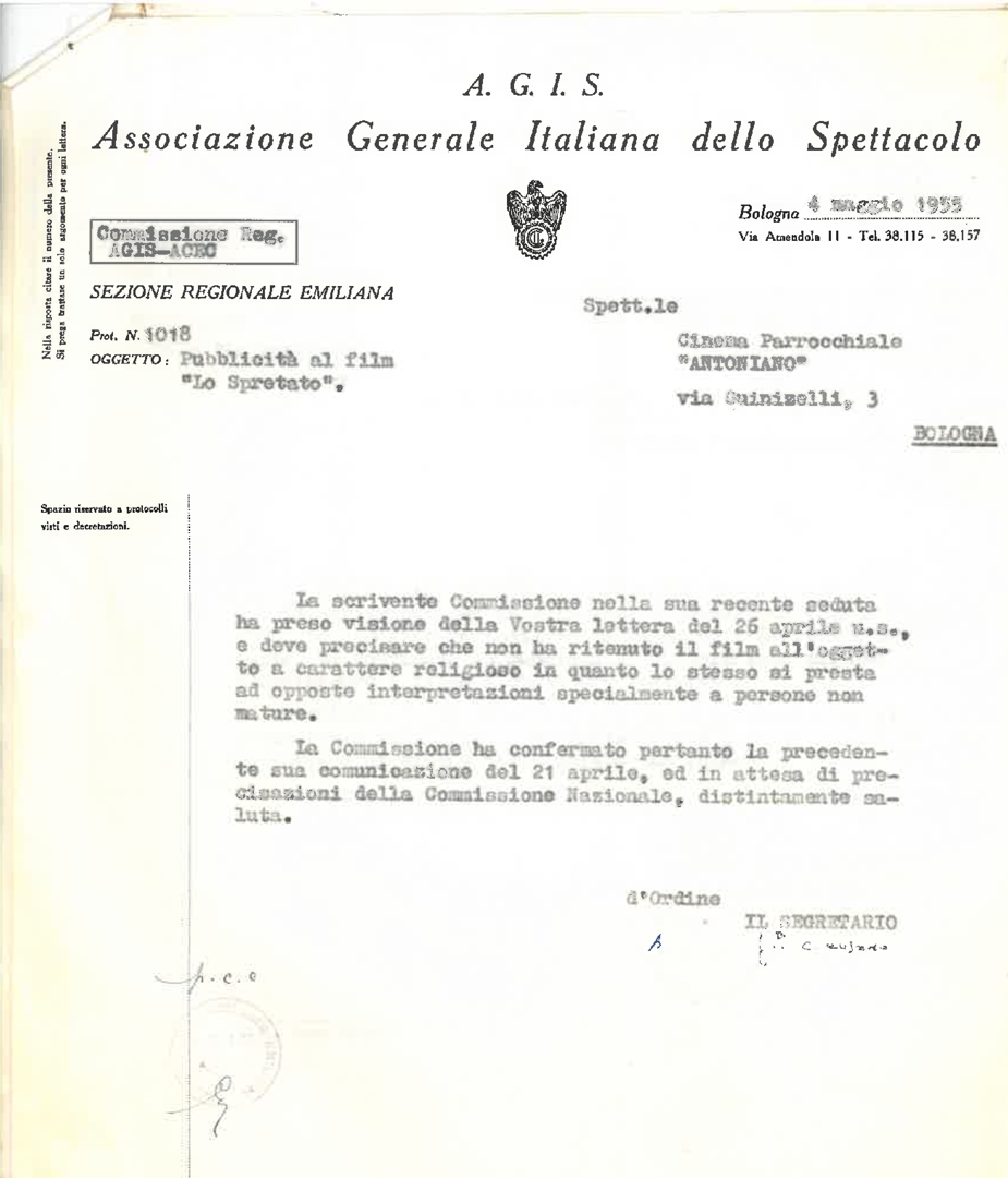 La Commissione risponde ad una nota del cinema "Antoniano" del 26 aprile, in merito alla classificazione del film "Lo spretato" non riconosciuto come film a carattere religioso. Minuta