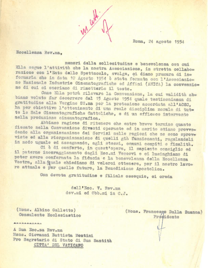 Galletto e Dalla Zuanna informano Montini della stipula, con l'Associazione nazionale industrie cinematografiche e affini - ANICA, di una convenzione finalizzata alla definizione di "una reale disciplina morale di tutte le sale cinematografiche cattoliche e di un efficace intervento nella produzione cinematografica". Minuta