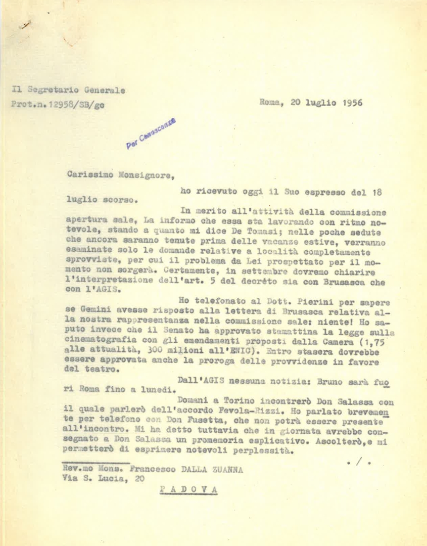 Lettera di Silvano Battisti, segretario generale dell'ACEC al presidente mons. Francesco Dalla Zuanna
