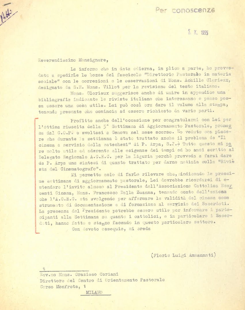 Ammannati scrive a Ceriani sulle attività del Centro di orientamento pastorale tra cui l'inziativa organizzata a Genova, "Il cinema a servizio della catechesi" con la partecipazione del gesuita p. Arpa e lo invita a coinvolgere mons. Francesco Dalla Zuanna in occasione delle settimane di aggiornamento pastorale. Minuta