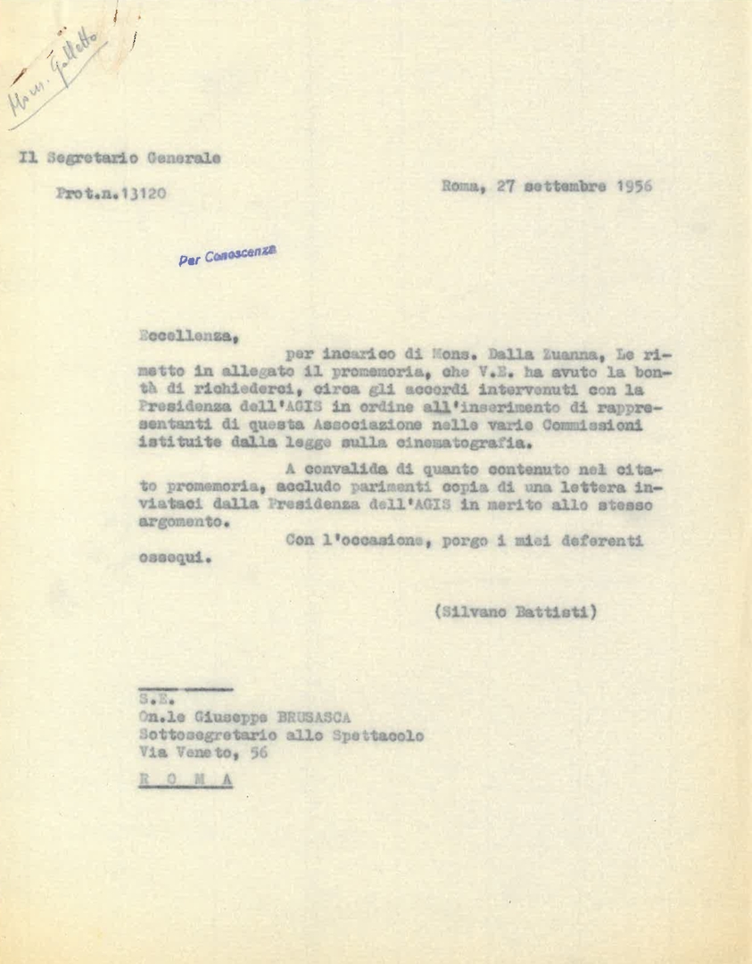 Battisti invia a Brusasca un promemoria sugli accordi con l'AGIS sull'inserimento di rappresentanti ACEC nelle commissioni istituite dalla legge sulla cinematografia. Minuta