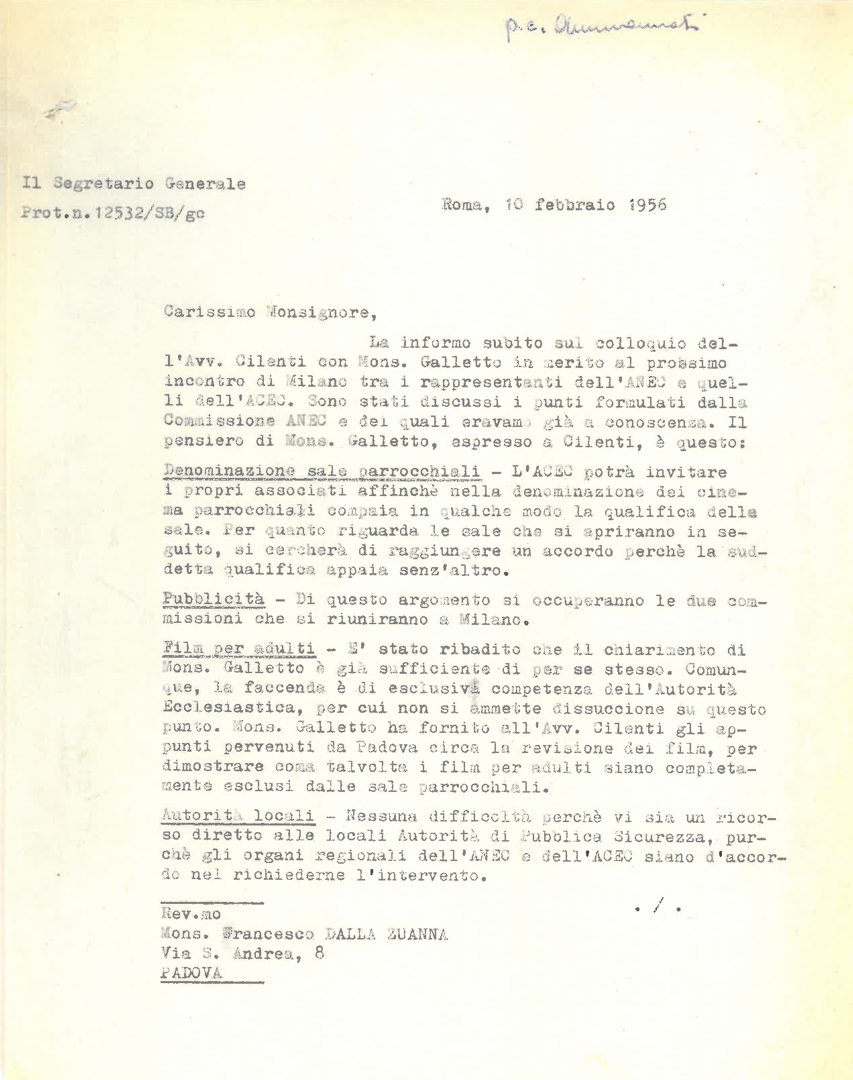 Battisi informa Dalla Zuanna e per conoscenza Ammannati, sull'imminente incontro a Milano con i rappresentanti dell'ANEC e riassume i vari punti di discussione elaborati da mons. Galletto della Commissione ANEC: "denominazione sale parrocchiali; pubblicità; film per adulti; autorità locali; numero posti". MInuta