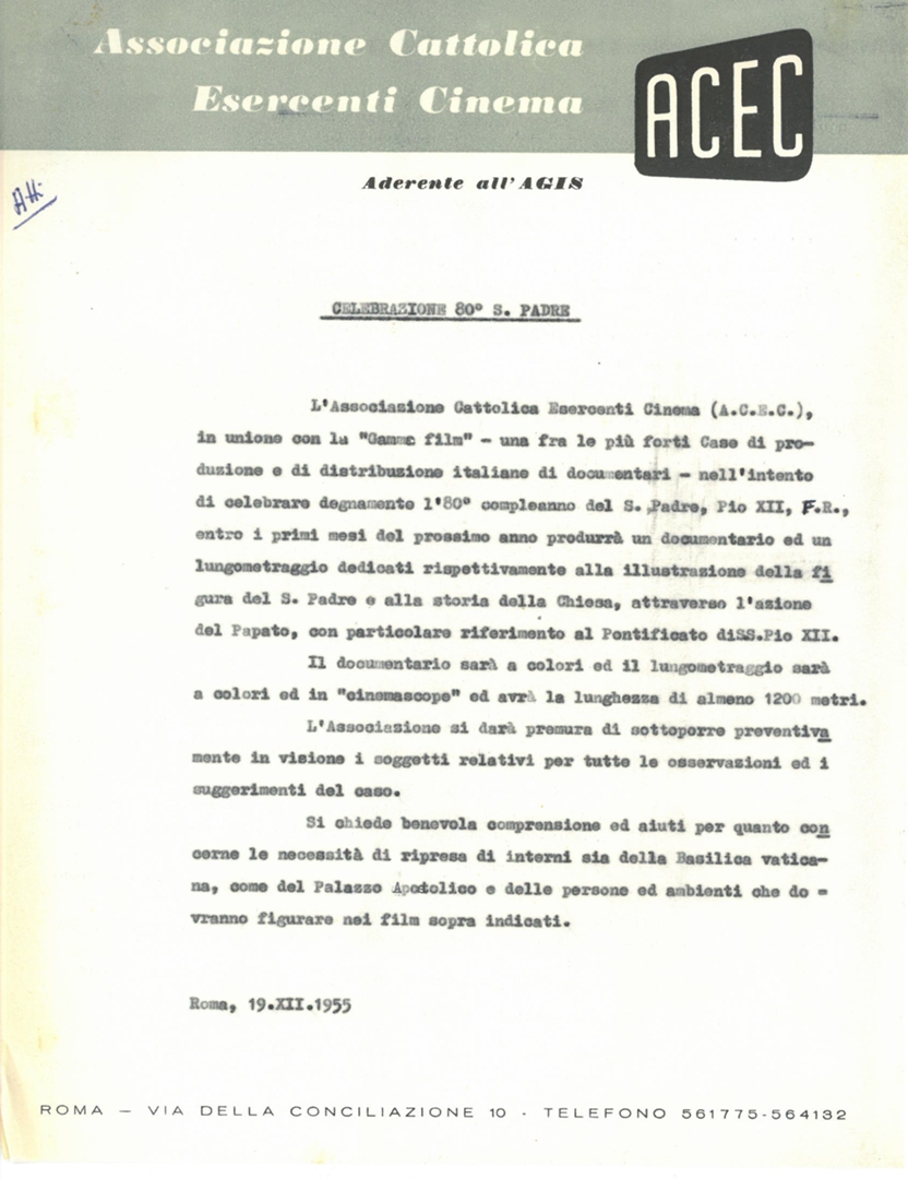 Comunicato dell'ACEC sulla realizzazione, in collaborazione con la società di produzione Gamma Film, di un lungometraggio sulla figura del PIO XII e l'azione del suo pontificato