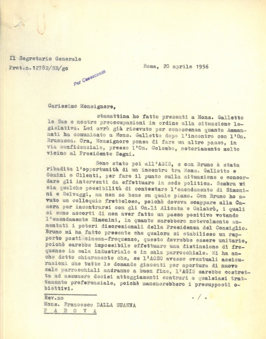 Battisti scrive a Dalla Zuanna su vari temi: legge sulla cnematografia, contatti con gli on. Brsusasca e Colombo, e interventi da concordare con l'AGIS in sede politica sugli emendamenti; contatti con AGIS-Minerva; rapporti con l'ANICA in merito alle sale parrocchiali SAS e alla loro inclusione nel piccolo esercizio e relativi benefici. Allega promemoria sulla situazione in seguito all'emendamento Simonini e la composizione della I°commissione del Senato.
