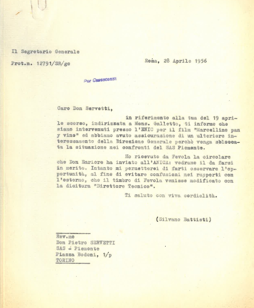 Battisti risponde alla lettera di Servetti del 19 aprile 1956 in merito al SAS Piemonte comunicando un intervento "presso l'ENIC per il film "Marcellino pan y vino". MInuta