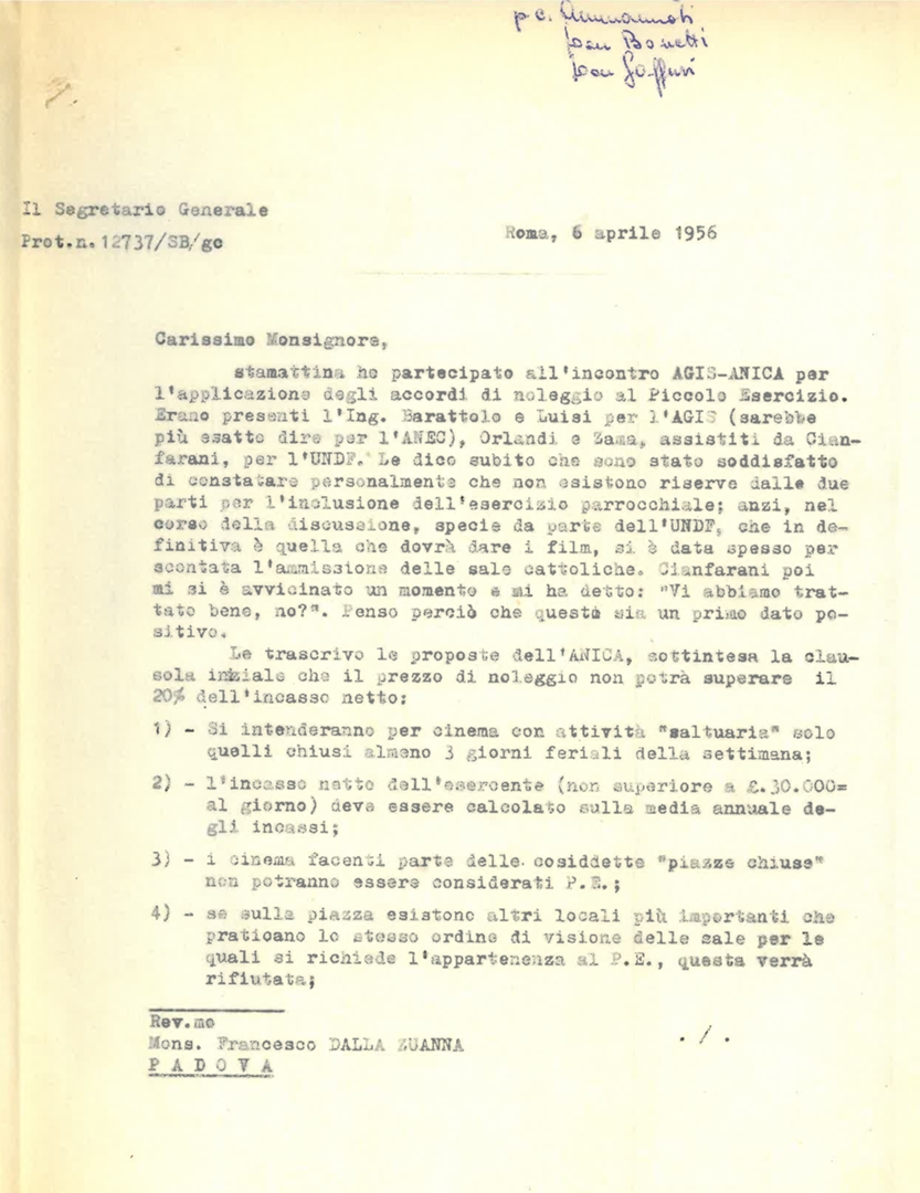 Battisti riferisce dettagliatamente a Dalla Zuanna e per conoscenza a Gaffuri e Bonetti, in merito all'incontro AGIS-ANICA per l'applicazione degli accordi di noleggio al Piccolo esercizio e all'inclusione, in tale categoria, delle sale parrocchiali. Minuta