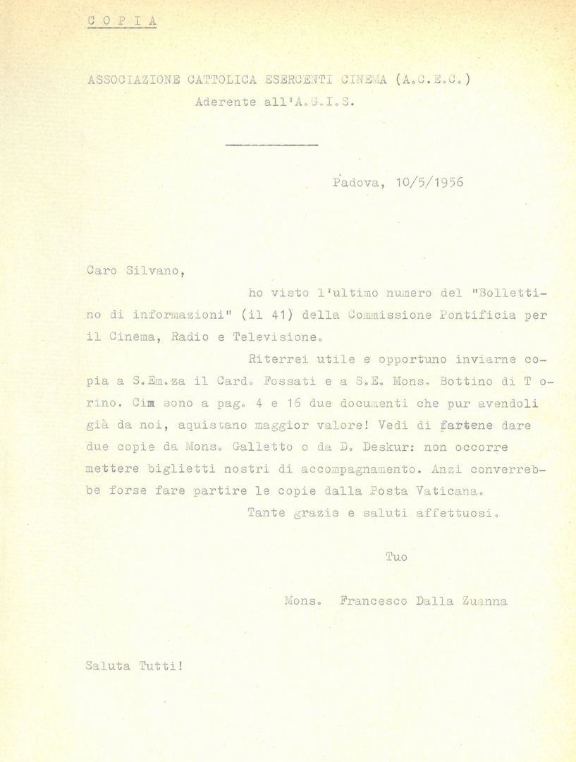 Mons. Francesco Dalla Zuanna chiede a Silvano Battisti di inviare alcune copie del Bollettino di informazioni della pontificia commissione per il cinema n.41. Dattiloscritto