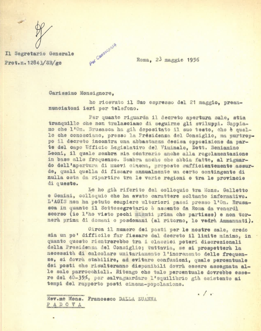 Silvano Battisti risponde a mons. Francesco Dalla Zuanna in merito al decreto aperura sale e lo aggiorna sugli ultimi avvenimenti riguardanti l'Associazione. Dattiloscritto