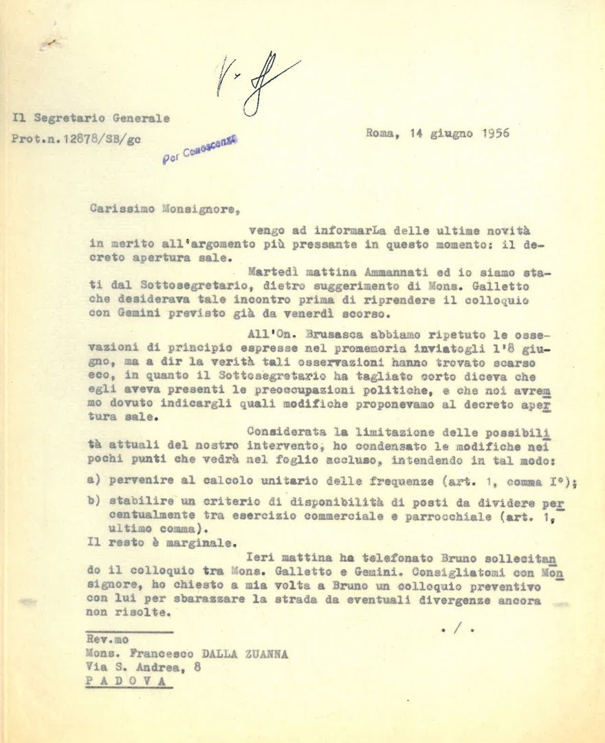 Lettera di Silvano Battisti, segretario generale dell'ACEC, a mons. Francesco Dalla Zuanna, presidente dell'ACEC