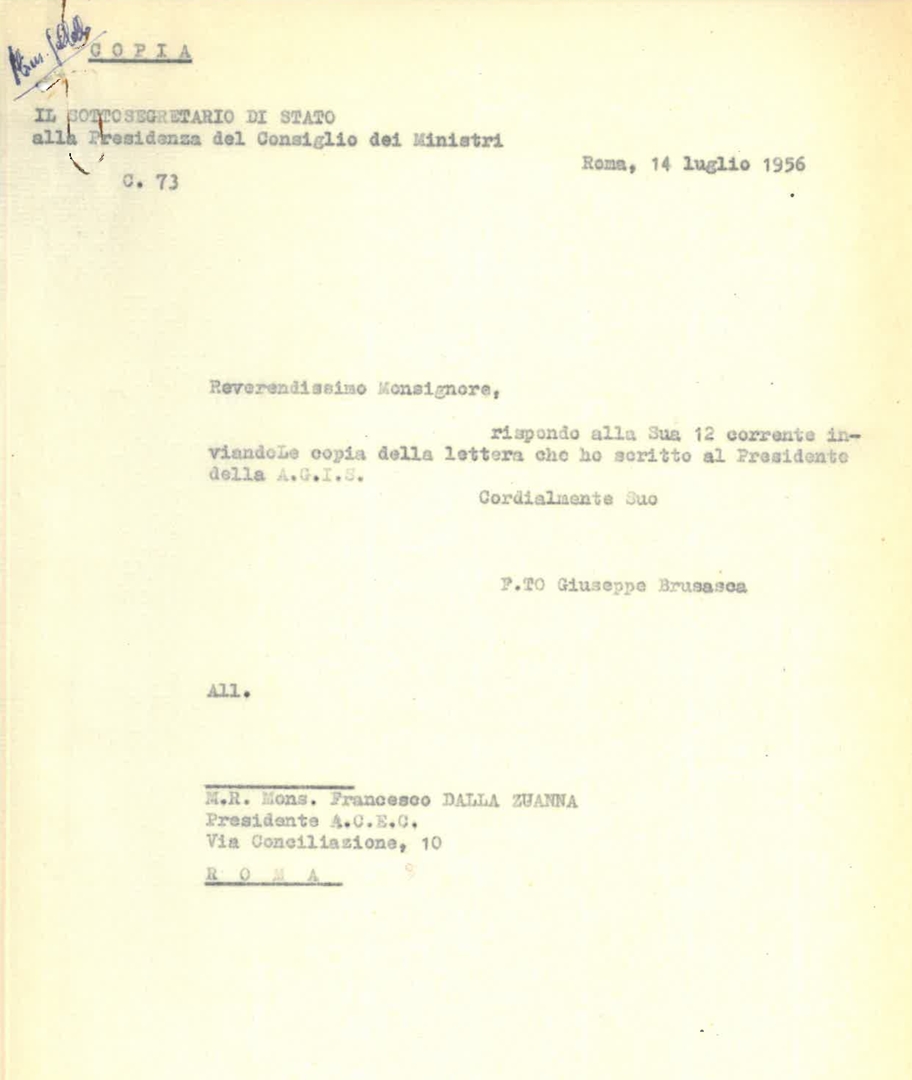 Lettera dell'on. Giuseppe Brusasca, sottosegretario di Stato alla Presidenza del consiglio dei ministri, a mons. Francesco Dalla Zuanna, presidente dell'ACEC