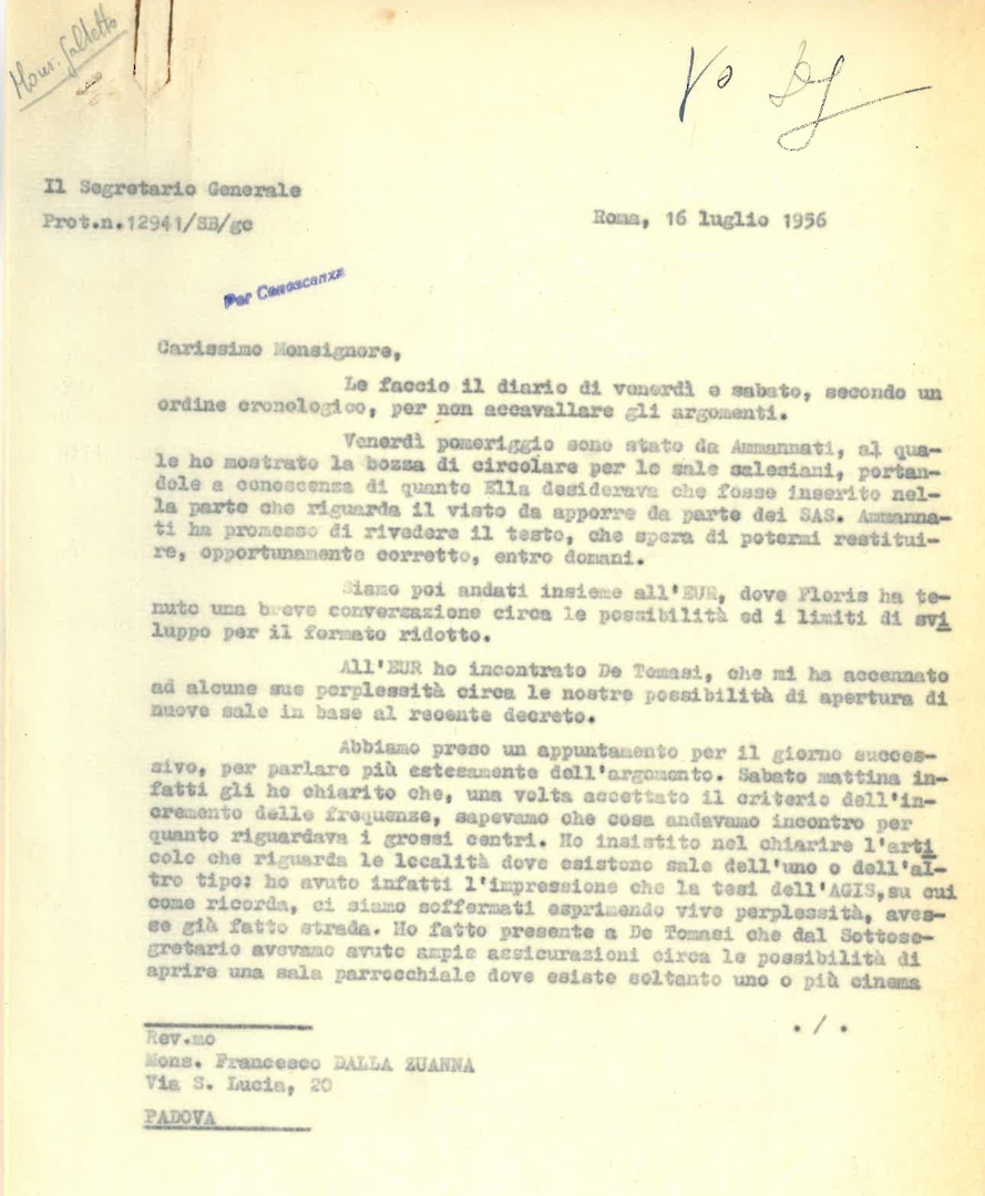Silvano Battisti fornisce a mons. Francesco Dalla Zuanna aggiornamenti sugli incontri e i colloqui avuti nelle ultime quarantott'ore e acclude copia del testo dell'accordo firmato a Torino tra il titolare della Nova film e il direttore tecnico del Servizio assistenza sale. Dattiloscritto