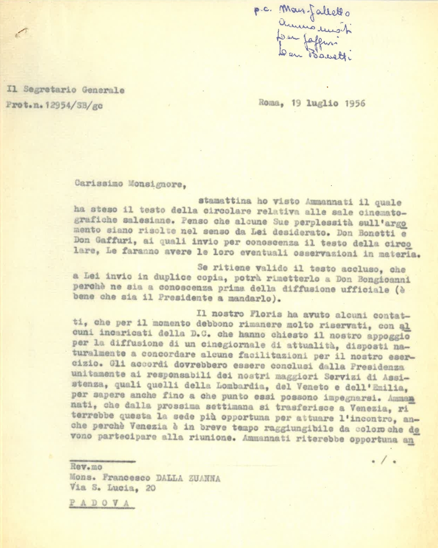 Silvano Battisti fornisce a mons. Francesco Dalla Zuanna aggiornamenti sugli ultimi incontri e colloqui avuti e acclude bozza della circolare in materia di sale cinematografiche salesiane. Dattiloscritto