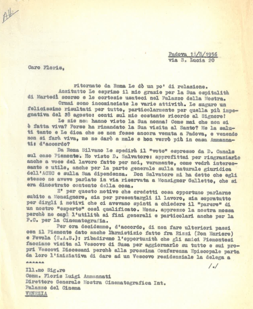 Lettera di mons. Francesco Dalla Zuanna, presidente dell'ACEC, a Floris Luigi Ammannati, direttore della Mostra internazionale del cinema di Venezia