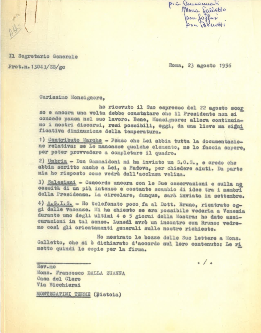 Silvano Battisti riepiloga a mons. Francesco Dalla Zuanna i punti all'ordine del giorno: contributo alle Marche e all'Umbria, rapporti con i salesiani, orientamenti dell'Associazione Generale Italiana dello Spettacolo - AGIS e della Società Italiana degli Autori ed Editori - SIAE. Dattiloscritto