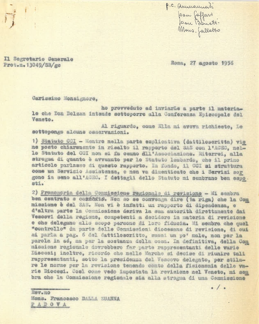 Silvano Battisti sottopone a mons. Francesco Dalla Zuanna alcune considerazioni in merito allo statuto del CCI e ai lavori della Commissione regionale di revisione. Dattiloscritto