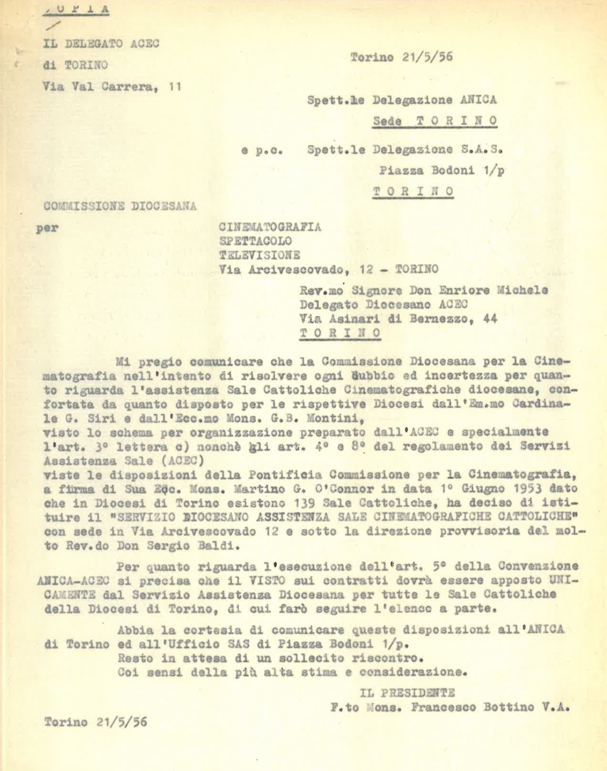 Lettera di Francesco Bottino, vescovo ausiliare di Torino e delegato ACEC per il Piemonte, alle delegazioni dell'Associazione nazionale industrie cinematografiche ed affini - ANICA e Servizio assistenza sale - SAS di Torino