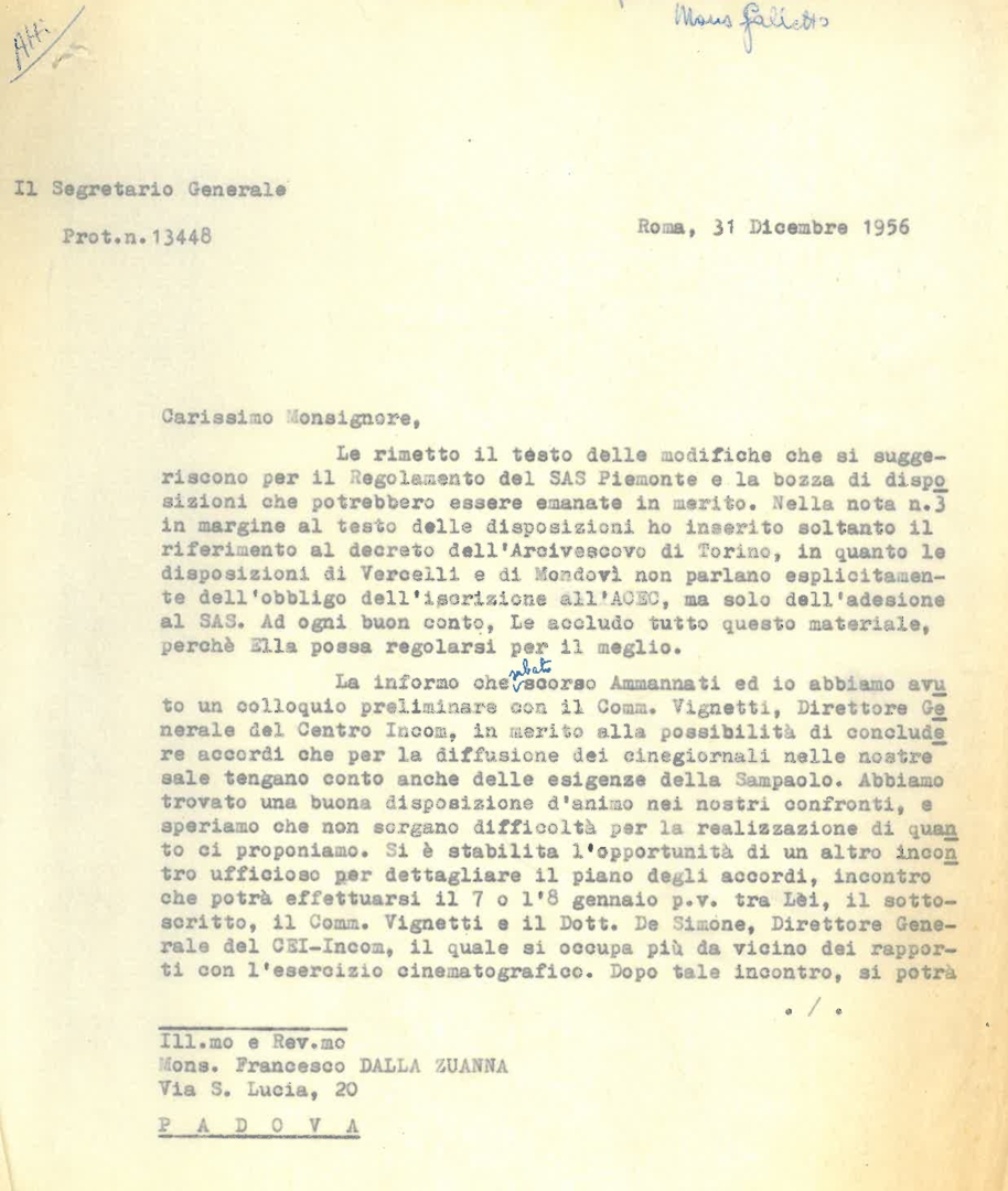 Silvano Battisti comunica a mons. Francesco Dalla Zuanna le nuove disposizioni sul SAS del Piemonte e gli accordi per la diffusione dei cinegiornali. Dattiloscritto
