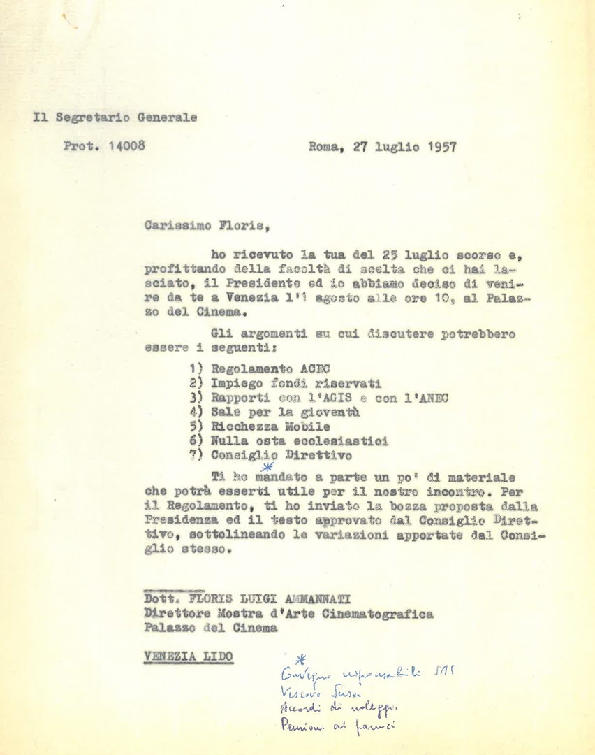 Lettera di Silvano Battisti, segretario generale dell'ACEC, a Floris Luigi Ammannati, direttore della Mostra internazionale del cinema di Venezia
