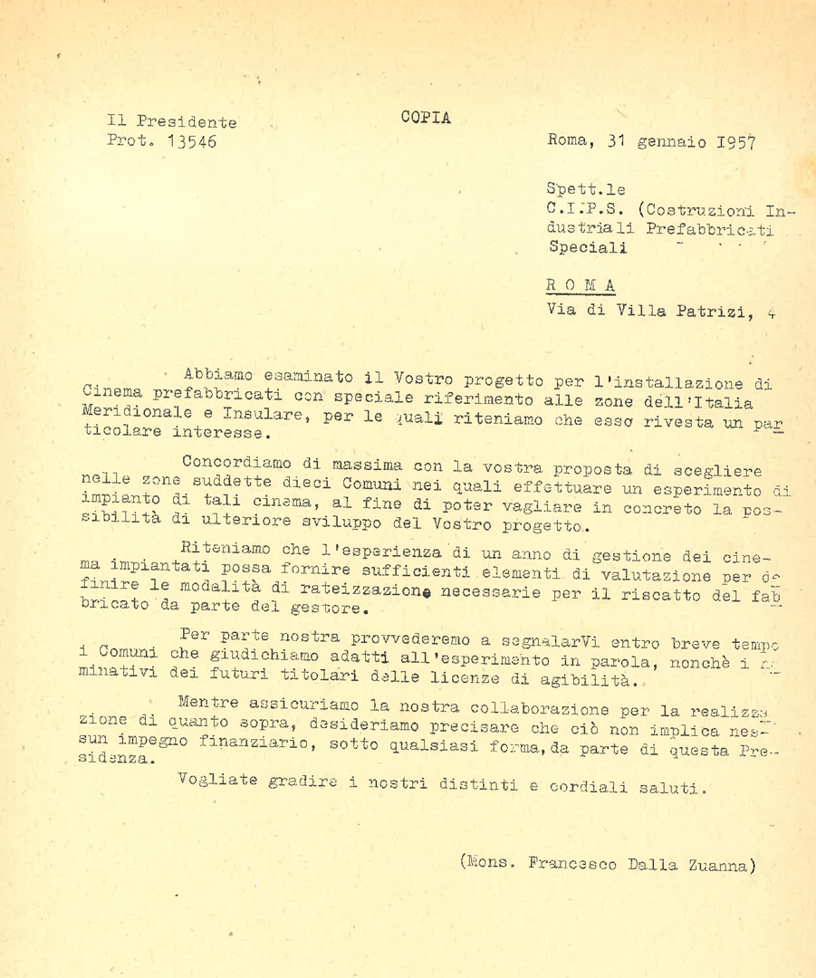 Mons. Francesco Dalla Zuanna scrive in merito al progetto sperimentale per l'installazione di cinema prefabbricati nelle zone meno avvantaggiate, in particolare dell'Italia meridionale e insulare. Dattiloscritto