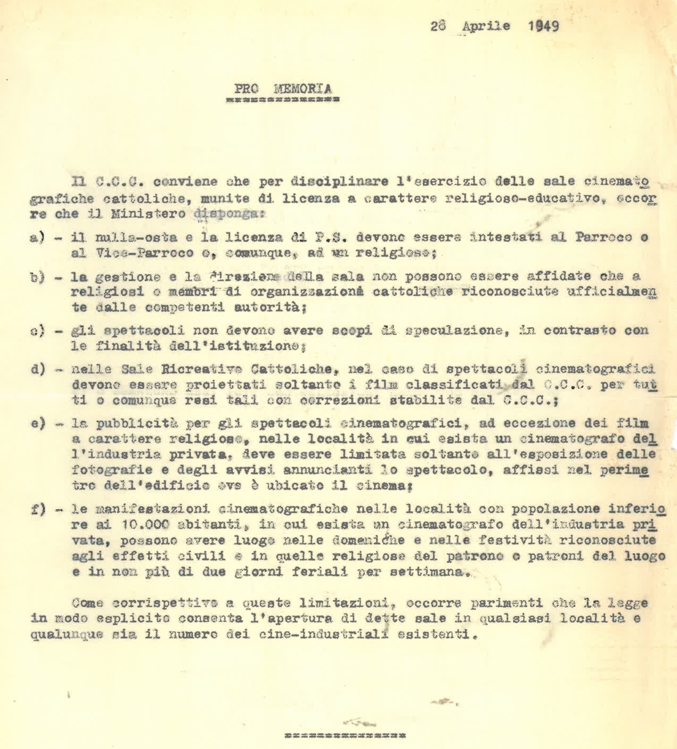 Nota del Centro cattolico cinematografico - CCC sulla necessità dell'intervento del Ministero per disciplinare l'esercizio della sale cinematografiche cattoliche munite di licenza a carattere religioso-educativo. Dattiloscritto