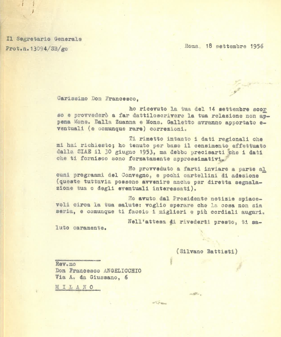 Lettera di Silvano Battisti, segretario generale dell'ACEC, a don Francesco Angelicchio, consulente ecclesiastico dell'Ente dello spettacolo